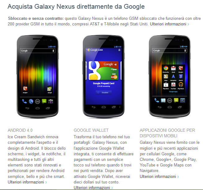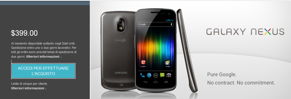 Google in maniera molto silenziosa, sta mettendo in campo tutta la sua potenza di fuoco e se a brevissimo vedremo il suo nuovo servizio Cloud, quasi in contemporanea ha reso possibile l’acquisto via Play Store del suo Galaxy Nexus GSM in versione unlocked a 399$, che al cambio attuale farebbe circa 302 € a cui bisogna aggiungere un 10% almeno di tasse. Comunque questo è certamente un ottimo prezzo.