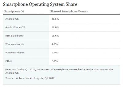 Secondo la società di ricerca Nielsen , nel mese di Marzo 2012 più della metà dell’utenza mobile negli Stati Uniti (per l’esattezza il 50,4%) possedeva uno smartphone. Android e iOs continuano indisturbati a dominare il mercato con rispettivamente il 48,5% ed il 32%, RIM è ancora in calo fermandosi all’11,6%. Fanalino di coda è la piattaforma di Microsoft, che con il suo vecchio Windows Mobile è al 4,6%, il nuovo OS Windows Phone non va oltre l’1,7 % dell’intero mercato.