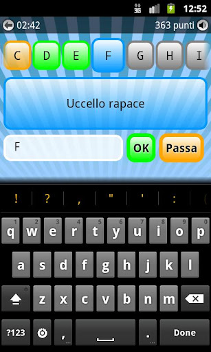Durante ogni partita ti verranno poste 21 domande di diversa difficoltà e su vari argomenti, una per ogni lettera dell’alfabeto. Per ogni domanda puoi utilizzare un “passo” che ti consente di rispondere al giro successivo.
