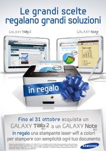 Il meglio della tecnologia mobile e di stampa Samsung diventa ancora più conveniente per consentire a tutti i consumatori di sperimentare un’incredibile esperienza tecnologia a casa come in ufficio e di combinare al meglio creatività e produttività. Con la nuova promozione Samsung tutti gli acquirenti di un GALAXY Tab 2 da 10.1 pollici (Wi Fi e 3G) o di un Galaxy Note 10.1 riceveranno in omaggio una stampante laser wireless CLP-365W compatta ed elegante, che permette di stampare in modo semplice e veloce i contenuti preferiti anche senza connessione di rete grazie alla tecnologia Wi-Fi Direct.