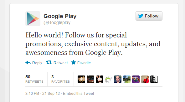 Da oggi sarà possibile seguire il Play Store di Google anche attraverso l’account appena aperto su Twitter e promette di fornire contenuti esclusivi, info su aggiornamenti, offerte speciali e tutto ciò che riguarda il panorama software di Android, video, musica e libri.