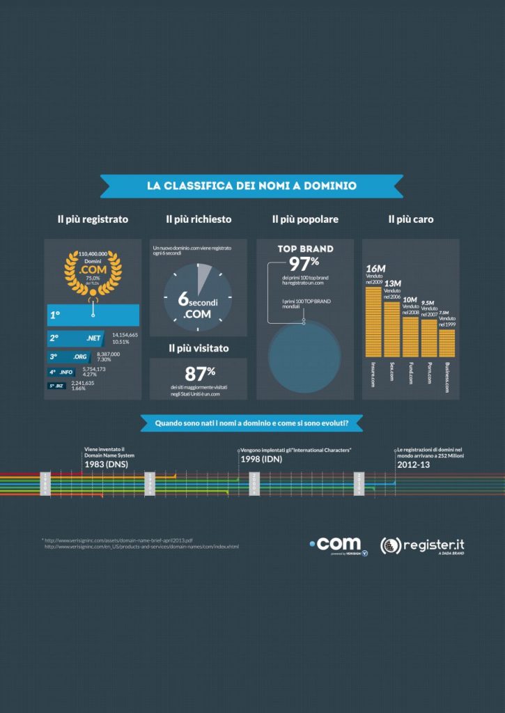 Il .com è in effetti il dominio generico più registrato al mondo e con 110,41 milionia fine 2012 supera il 75% di tutti i domini generici registrati; inoltre, il 97% dei primi 100 Top Brand nel mondo ha registrato un .com. Dati interessanti che esemplificano la rilevanza del fenomeno e che Register.it sta divulgando attraverso un’infografica esplicativa che mostra la classifica e il percorso evolutivo dei nomi a dominio.