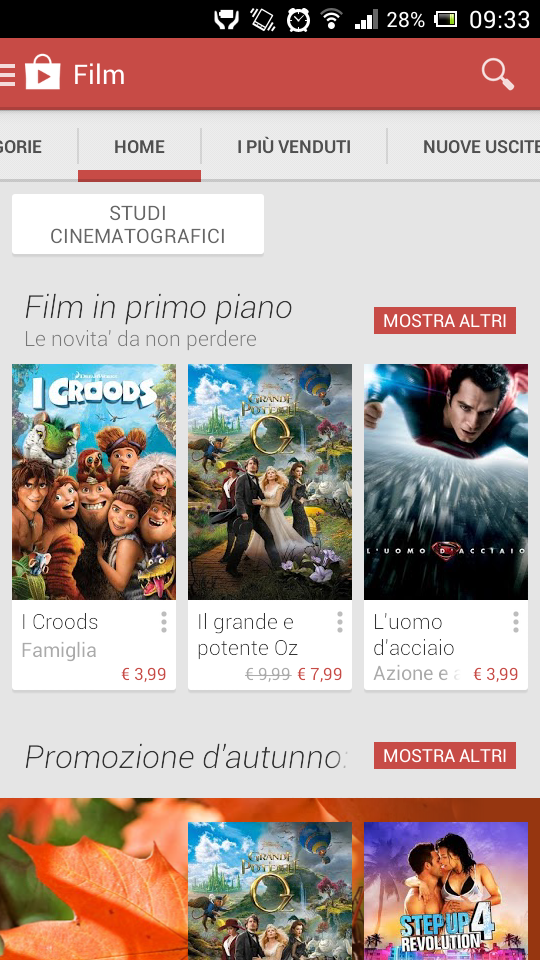 In questa area dedicata troverete le consuete categorie “I più venduti”, “Nuovi uscite”, oltre ad una sezione divisa per studi cinematografici raggiungibile dalla Home della sezione Film e alla consueta divisione in Categorie (Animazione, Azione e Avventura, Commedia, Drammatici, Famiglia, Horror). Non manca, nel menù laterale, una sezione dedicata ai film da noi acquistati, che richiede l’utilizzo dell’ultima versione dell’applicazione Play Movies.