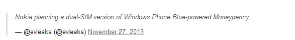 Secondo l’affidabile evleaks Nokia starebbe lavorando ad una versione Dual Sim di un prossimo Lumia, il cui nome in codice corrisponderebbe a Moneypenny. Tale dispositivo sarà distribuito con WP 8.1 già on board, oltre al supporto ai Dual Sim WP 8.1 Blue dovrebbe introdurre il tanto sospirato notification center, un miglior multi-tasking ed un assistente vocale sul modello di Siri.