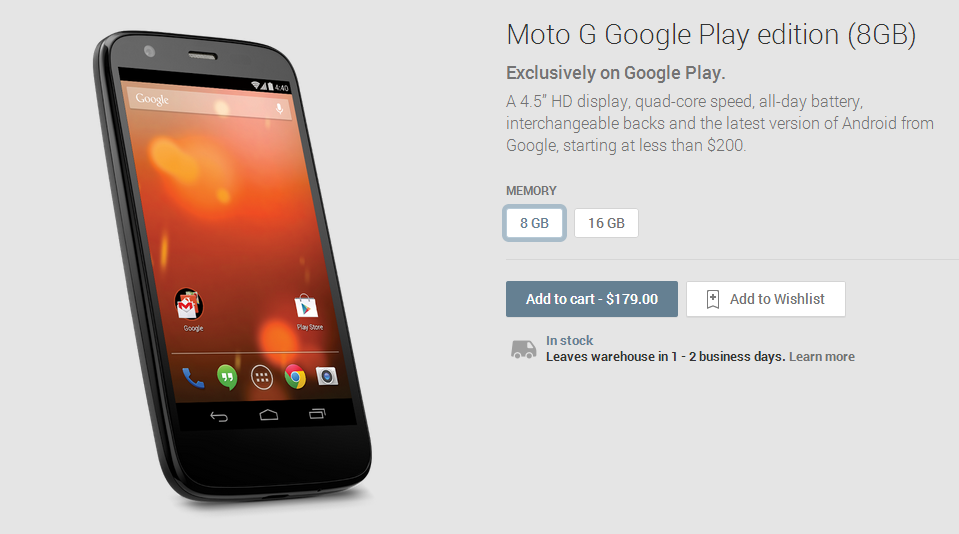 Il Moto G è ora in vendita nel Google Play Store, per il momento solo in quello U.S., al prezzo di 179$ per la versione da 8Gb e 199$ per quella da 16Gb, non abbiamo al momento notizie del suo eventuale sbarco in Europa, ma se ci verrà riservato lo stesso trattamento del Moto X …, scordiamoci di vederlo in Italia, come sempre molto lungimiranti in Motorola …
