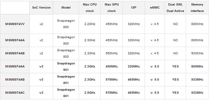 Come potete notare, nelle rispettive versioni di punta, l’801 raggiunge un maggior clock sia a livello CPU che GPU, l’801 supporta eMMC 5.0 che hanno un I/O di 400Mb/s contro i 200 della versione 4.5, inoltre supporta il protocollo Dual Sim Dual Active che consente di effettuare 2 chiamate simultanee su 2 diverse Sim.