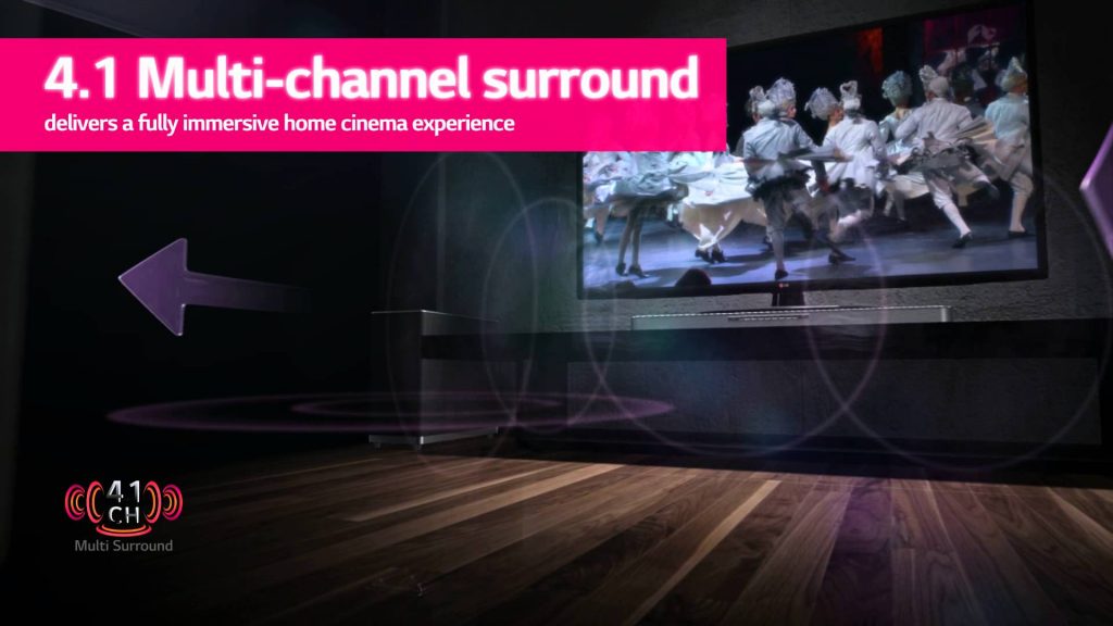 Con l’uscita audio a 4.1 canali e 320W di output, LAB540 emette un suono ricco e chiaro in diverse direzioni per offrire un’esperienza audio ad alta fedeltà. Dotata di un processore 3D Surround, la sottile SoundPlate crea un ambiente audio autentico e naturale che aumenta il senso di immersione di chi ascolta. La SoundPlate offre tre modalità ottimizzate – standard, musica, cinema – che si possono attivare premendo un semplice pulsante, per un ascolto personalizzato.