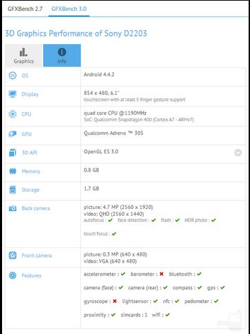 Un phablet Sony da 6.1″ è apparso su GFXBench, le caratteristiche tecniche sono, a detta di PhoneArena, stomachevoli … ma crediamo che anche il prezzo sia entry level, la definizione è molto bassa, 160ppi grazie alla risoluzione 854 x 480, processore Quad Core Snapdragon 400 Cortex-A7, GPU Adreno 305 GPU, 1GB di RAM, 4GB di memoria interna, Android 4.4.2, fotocamera posteriore da 5Mpixel e anteriore da 0,3.