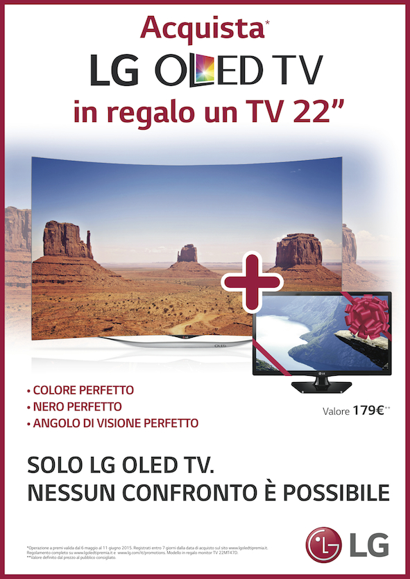 LG continua a puntare i riflettori sulla propria gamma di TV OLED con una nuova iniziativa: dal 6 maggio all’11 giugno 2015 tutti coloro che acquisteranno un TV della gamma OLED LG (modello 65EC970V, 55EC930V, 55EA980V, 55EA975V, 55EA970V) avranno in regalo l’esclusivo monitor TV LG 22MT47D con display IPS da 22 pollici Full HD.