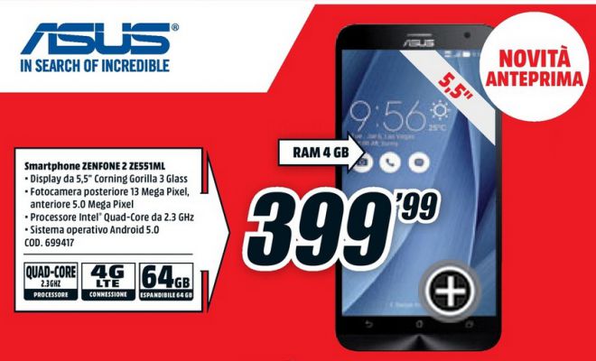 Uno dei must buy di quest’anno, l’Asus Zenfone 2 arriva da Media World, nella versione 4gb di RAM, con memoria interna da 64gb, la possibilità di espandere la memoria tramite microSD rimane, al prezzo di 399.99€.