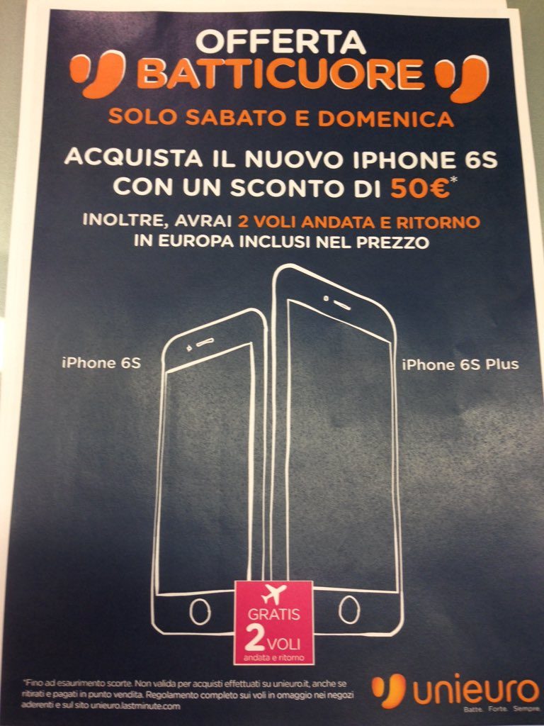 Il nostro follower Mirco, che ringraziamo, ci segnala l’offerta Unieuro valida solo oggi e domani, 50€ di sconto su iPhone 6s e 6s Plus, in più 2 voli andata e ritorno in Europa.