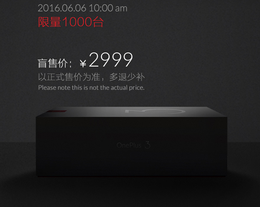 Inoltre il prezzo di 2.999 yuan non è quello definitivo, perché il prezzo reale di OnePlus 3 sarà comunicato il 14 giugno: se questo si rivelasse superiore a quanto pagato dagli acquirenti del 6 giugno, questi potranno tirarsi indietro o decidere se versare la differenza; nel caso che il prezzo finale fosse inferiore, saranno rimborsati della differenza.