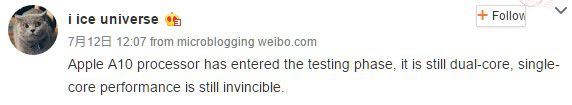 Stando a quanto emerso da una fonte cinese su Weibo, il nuovo Apple A10 è dotato di una CPU dual core con prestazioni single core impressionanti. Il processo produttivo dovrebbe rimanere a 16nm, lo stesso di A9, visto che la sua produzione sarà affidata completamente a TSMC.