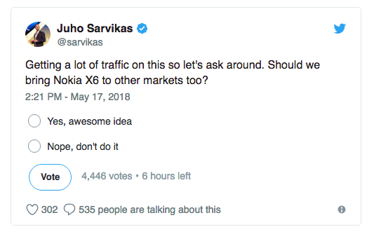Nokia X6 è stato presentato ieri da HMD, è uno smartphone che si “adegua” al design del momento con caratteristiche da medio di gamma, ufficialmente sarà solo per il mercato cinese ma il CPO Juho Sarvikas ha lanciato su Twitter un sondaggio per sapere quanti lo vorrebbero a livello globale: