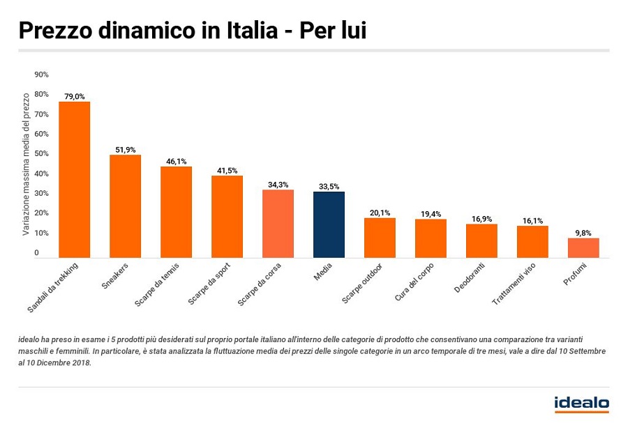 In particolare, idealo ha scoperto che le donne devono prestare particolare attenzione all’andamento dei prezzi in quanto i prodotti a loro dedicati sono caratterizzati da una fluttuazione media del 49,6%, dato ben superiore a quello relativo ai costi dei prodotti maschili, la cui variazione media si attesta intorno al 33,5%.