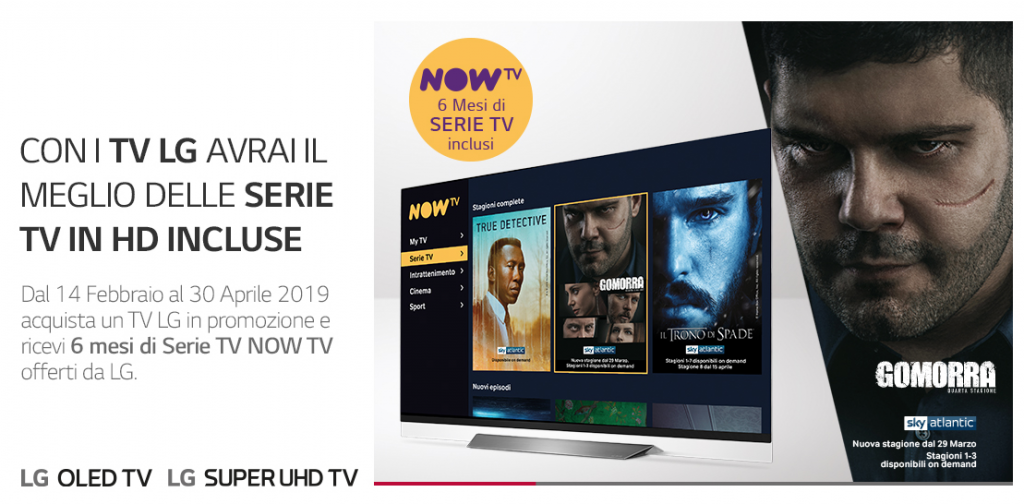 A partire da giovedì 14 febbraio e fino al 30 aprile 2019, LG regala infatti sei mesi di Serie TV su NOW TV in HD (qui il link alla promo): basta acquistare uno Smart TV LG in promozione, creare un account NOW TV e inserire il codice ricevuto all’acquisto. Il Ticket Serie TV di NOW TV permetterà di accedere a 4 canali live (Sky Atlantic FOX life, FOX e FOX Crime) con le Serie TV del momento anche in contemporanea USA e ad intere stagioni.