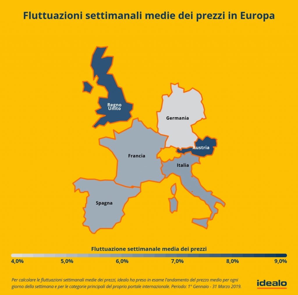 idealo – portale internazionale leader in Europa nella comparazione prezzi – ha deciso di indagare il fenomeno per capire quando è più conveniente acquistare online un dato prodotto e quando, invece, è tendenzialmente sconsigliato. Innanzitutto, ogni giorno è buono per risparmiare online e, grazie alla comparazione prezzi, si può arrivare ad un risparmio massimo medio del -5,8% se consideriamo tutte le categorie oggetto dello studio. In Europa questa percentuale è invece pari al -6,4%.