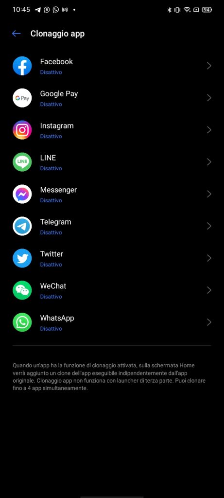Presente la Game Space e la possibilta’ di clonare le app, come Facebook, Instagram e Messenger per esempio, in modo tale da poter utilizzare due account contemporaneamente .