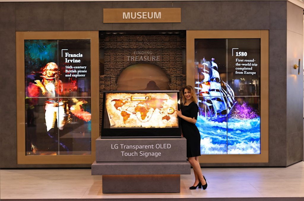 I display LG OLED Transparent sono invece sempre più diffusi all’interno di ambienti business di livello premium e vengono utilizzati su pareti di vetro per creare immagini luminose e futuristiche e come utili strumenti per le riunioni. I display LG OLED Transparent vengono utilizzati anche nel settore dei trasporti come display pubblicitari o informativi sulle pareti di vetro delle stazioni. Si inserisce anche perfettamente all’interno dei musei dove viene utilizzato all’ingresso per dare il benvenuto ai visitatori o per sovrapporre gli oggetti al contesto e offrire un’esperienza immersiva. LG OLED Transparent Touch è diventato molto popolare tra i display interattivi.