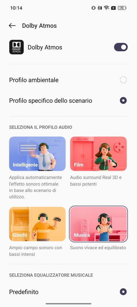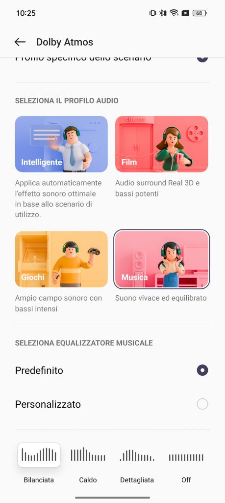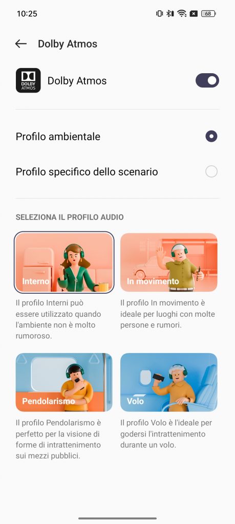La sezione Dolby Atmos permette di personalizzare i profili di ascolto. Potremmo quindi settare i profili ambientali interno, in movimento, pendolarismo o volo, e quello specifico dello scenario, che potrà essere :