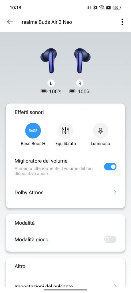 Una volta associate, potremmo andare a settare gli effetti sonori utilizzando modalità di ascolto Bass Bost +, equilibrata o luminoso, aumentare all’estremo il volume di ascolto, attivare la modalità gioco e personalizzare i controlli touch.