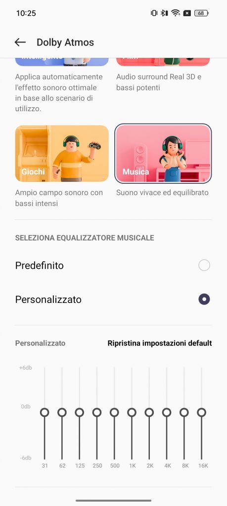 Inoltre è presente un completo equalizzatore, con impostazioni predefinite ( bilanciato, dettagliato, caldo, off ) oppure personalizzato, dove l’utente finale andrà a bilanciare le frequenze in base ai propri gusti.