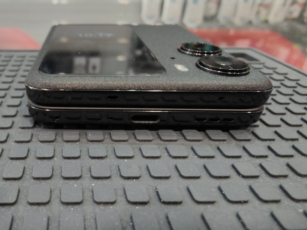 Da chiuso, la parte superiore è quella più “affollata” e comprende l’ampio display secondario da 3.26” nella parte sinistra e il comparto cam in quella destra, quella inferiore invece è solo composta dall’altra metà della back cover.