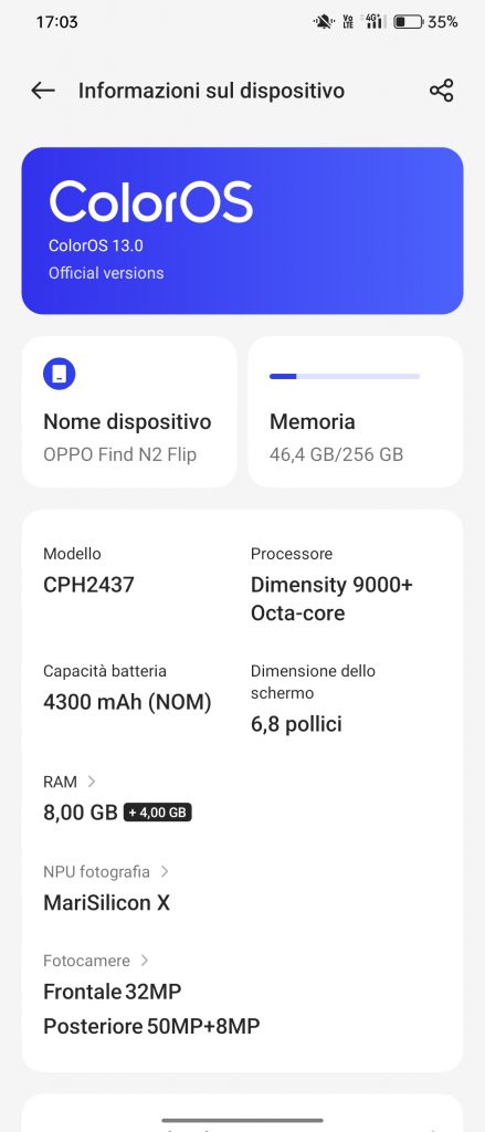 Oppo Find N2 Flip ha quindi tutto ciò che ci si aspetta da un device importante, con i limiti però fisici che derivano dal form factor pieghevole a conchiglia.