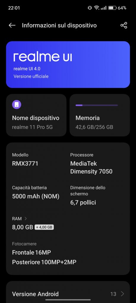 Il processore è il MediaTek Dimensity 7050 5G da 2,60 Ghz e processo produttivo a 6 nanometri, diretto successore del 920 utilizzato su Realme 9 Pro+ e del 1080 che lo stesso produttore ha montato sul 10 Pro+, interessantissimo modello da noi recensito QUI, ma mai commercializzato in Europa.