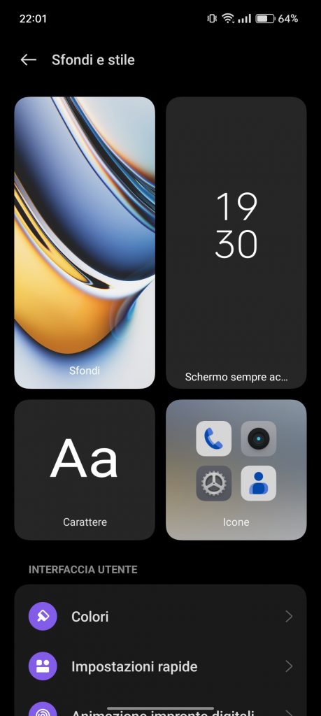 Numerose sono le personalizzazioni, tutte raccolte razionalmente all’interno di un menù dove praticamente è possibile stravolgere a piacimento tutta la grafica a partire dai temi, dagli sfondi dinamici e statici, colore, forma icone e controlli rapidi, font, dimensione caratteri, always on display, che ora supporta anche i controlli rapidi per Spotify.