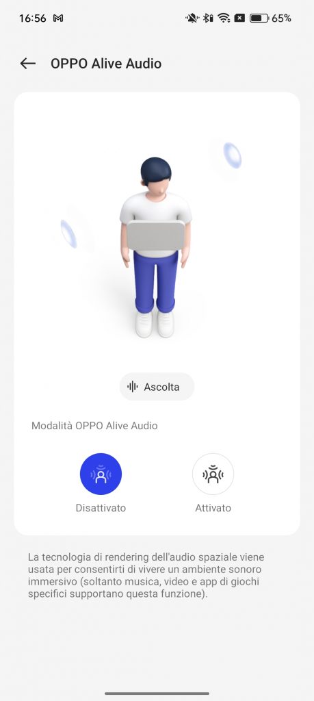 La presenza dei bassi è predominante, ma non tale da prevaricare totalmente. Medi e alti saranno quindi udibili grazie soprattutto all’algoritmo proprietario Oppo Alive Audio che permette di avere un suono sourround tridimensionale che quindi riuscirà a esaltare anche, per esempio, le voci e i suoni più acuti.
