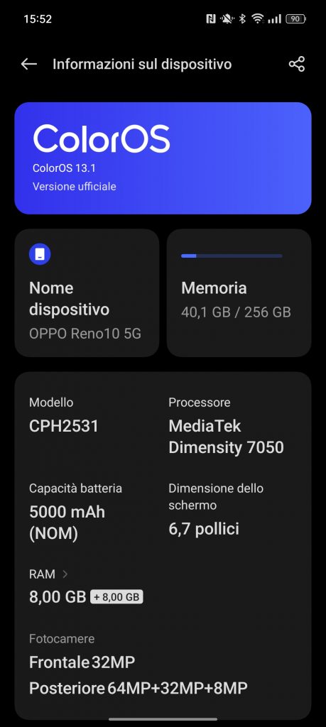 Una grande differenza rispetto alla versione Pro è rappresentata dal cuore pulsante del Reno10 5G, che è il nuovo MediaTek Dimensity 7050 5G con processo produttivo a 6 nanometri, GPU Mali-G68 MC4 con a supporto 8 GB di Ram DDR4X espandibili via software di altri 8 GB e 256 GB di memoria Rom, in questo caso fissa.