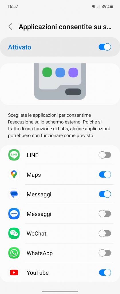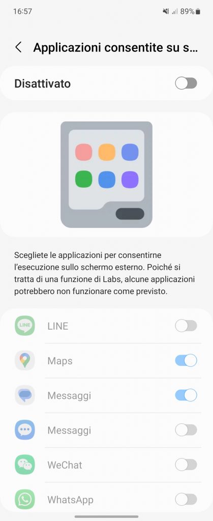 Sempre in merito alla vera novità di Flip 5, ovvero il display esterno, si potranno selezionare delle risposte rapide per interagire direttamente con le notifiche, oltre che accedere a una sezione sperimentale dove si potrà selezionare il multischermo, attivare il pannello Flex e, molto interessante, abilitare delle applicazioni completamente utilizzabili a smartphone chiuso, come Maps, messaggi, WhatsApp, YouTube, Line e WeChat.