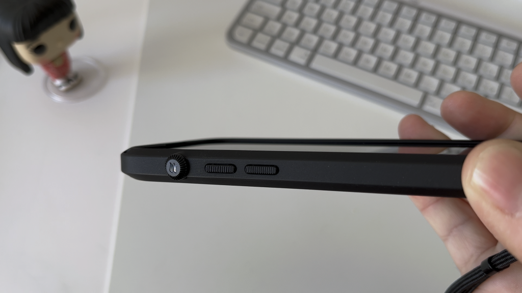 Lungo i bordi destro e sinistro corre una trama leggermente zigrinata, antiscivolo, molto piacevole, che diviene ancora più percepibile in corrispondenza dei tasti che oltre a essere ben protetti, sono quindi facilmente rilevabili.