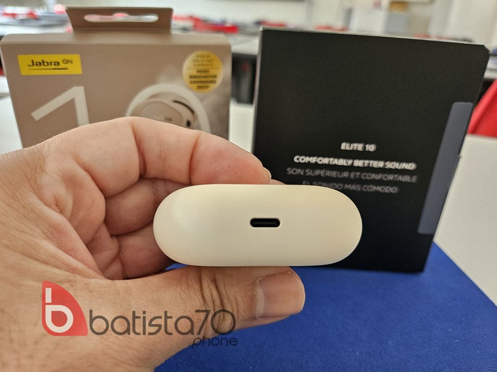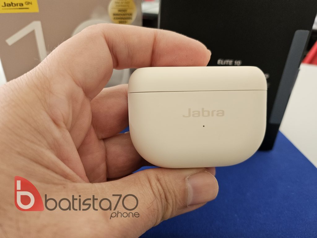 Ha una forma stondata sul lato inferiore, dove è presente la porta Usb C per la ricarica sul lato anteriore invece è posizionato il led di stato ed il logo Jabra, mentre il retro e i lati esterni sono puliti.