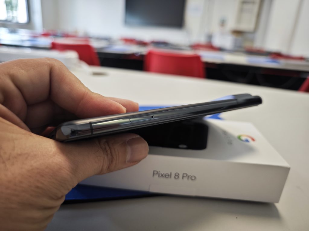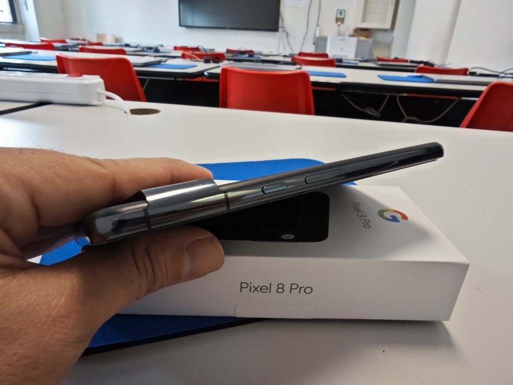 Alluminio invece per il frame e per il camera bar, dello stesso colore. Il “fascione” contenente il comparto cam principale sporge di qualche millimetro e può essere utilizzato come appoggio per il dito indice quando Pixel 8 Pro viene utilizzato con una sola mano, mentre quando il terminale è appoggiato su una superfice piana questo non traballa o scivola, ma rimane stabile e solo leggermente rialzato in modo uniforme nella parte superiore.