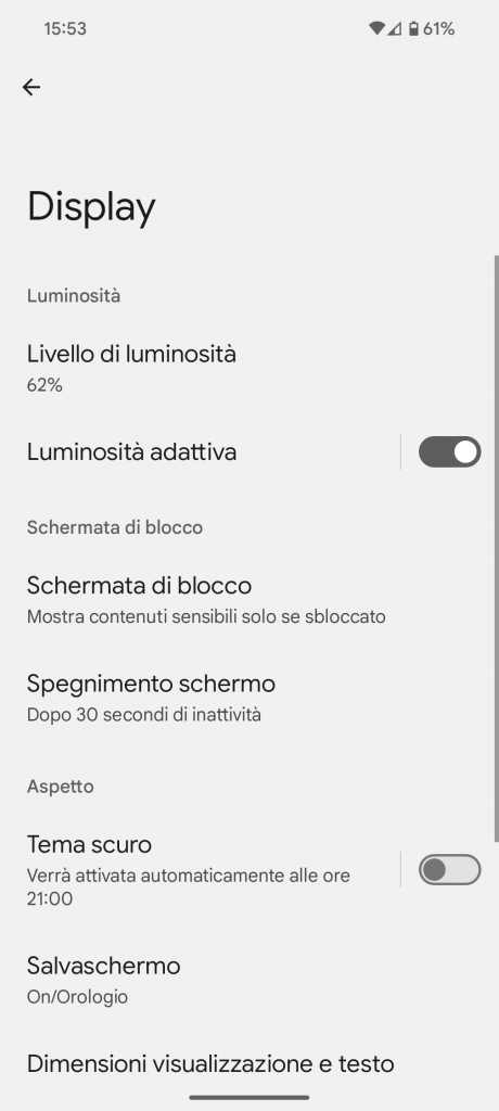Presenti numerose opzioni relative al pannello nel menù dedicato che consentono di personalizzare la modalità chiara o scura, luminosità adattiva, dimensioni di visualizzazione e di carattere, temperatura del calore, schermata di blocco, ecc…