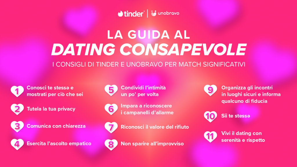 “Ciascun incontro rappresenta un’opportunità unica di instaurare connessioni significative. Empatia, gentilezza, rispetto e trasparenza costituiscono l’essenza vitale di ogni relazione costruttiva e appagante. Investire in sé stessi, coltivando questi elementi, è fondamentale per poterci relazionare con gli altri. Per questo, in sinergia con Tinder, ci proponiamo di promuovere una cultura di incontri consapevoli, incoraggiando le persone a prendersi cura di sé e a sviluppare una maggiore consapevolezza emotiva. La qualità delle connessioni che creiamo è, infatti, il riflesso diretto dell’attenzione dedicata a noi stessi”, ha commentato la Dottoressa Valeria Fiorenza Perris, Psicoterapeuta e Clinical Director di Unobravo.