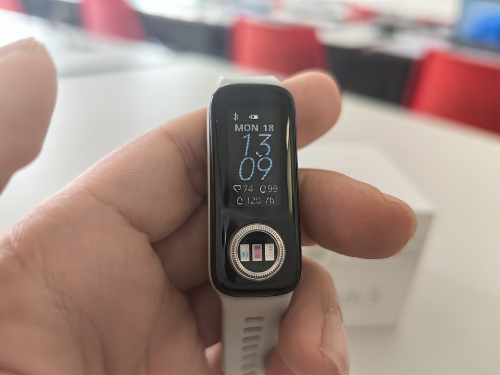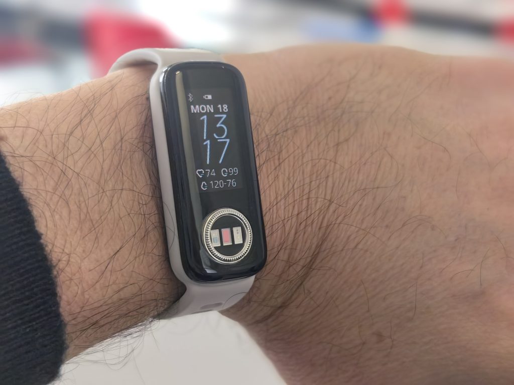 Comodo da indossare grazie a un peso ridotto a 30 grammi e a un cinturino che non infastidisce, sul fronte, spicca il display touch OLED a matrice passiva da 0,96 pollici, che offre una buona qualità visiva, sebbene non sia ottimale in condizioni di forte luminosità esterna.