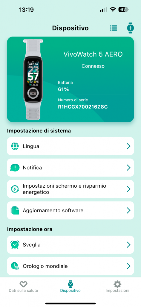 VivoWatch 5 Aero si distingue come un completo e compatto dispositivo di monitoraggio della salute e del fitness, grazie alla sua completa gamma di funzionalità e all’integrazione fluida con dispositivi mobili tramite Bluetooth.