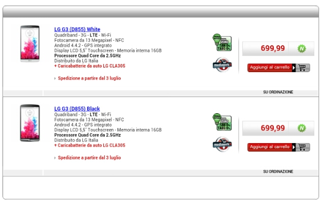 Il nostro amico Diego, di TecnoPhone, ha appena pubblicato la news del pre-ordine MediaWorld per LG G3, il prezzo è di 699€ e stiamo parlando della versione da 16Gb con