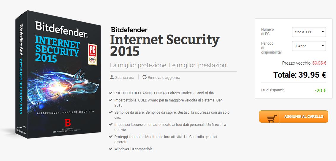 Antivirus Bitdefender Internet Security 2015 scontato di 20€ Bitdefender Internet Security 2015 è disponibile a 39.95€, con uno sconto di ben 20€ sul prezzo di vendita solito, la licenza è valida per 3 PC, una protezione totale per Lucio Lorenzo11 anni agoKeep Reading