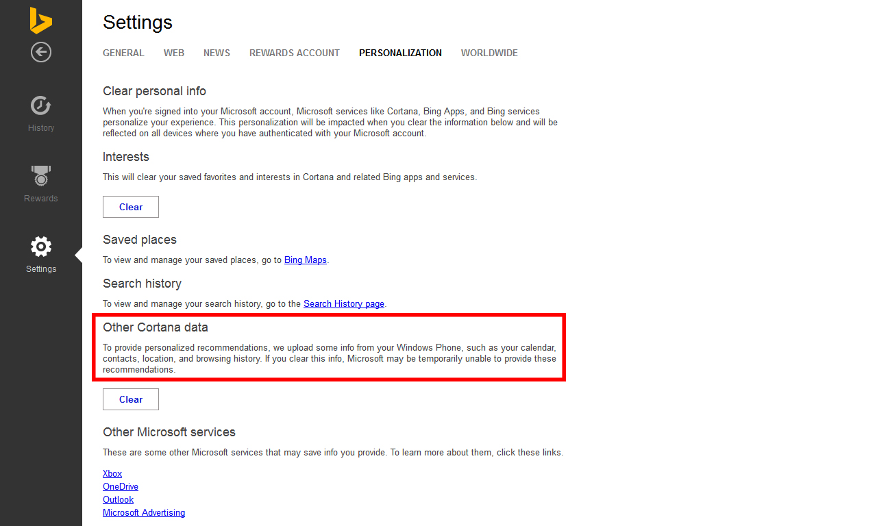 Visitando Bing.com ed impostando la propria nazionalità come Inglese o USA verranno visualizzate nuove impostazioni, tra cui quelle per i dati memorizzati dal tanto vociferato assistente vocale Cortana. A meno