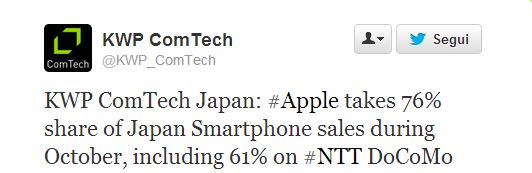 iPhone la fa da padrone nel mese di Ottobre in Giappone, il 76% delle vendite va appannaggio di 5S e 5C, il maggior carrier NTT DoCoMo ha visto scegliere dal