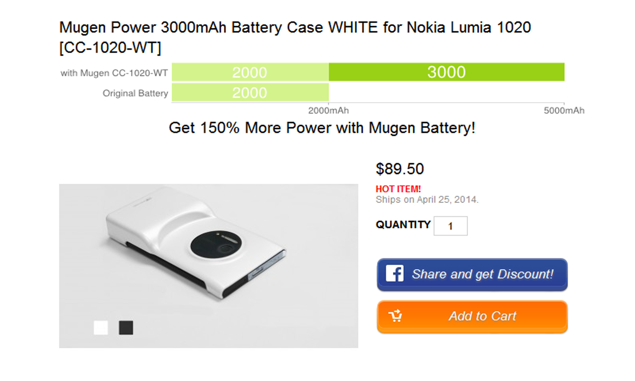 Mugen power ormai sinonimo di qualità in campo batterie sostitutive o supplementari, rende disponibile all'acquisto sul proprio sito il Camera Grip per Lumia 1020 con una batteria aggiuntiva da ben