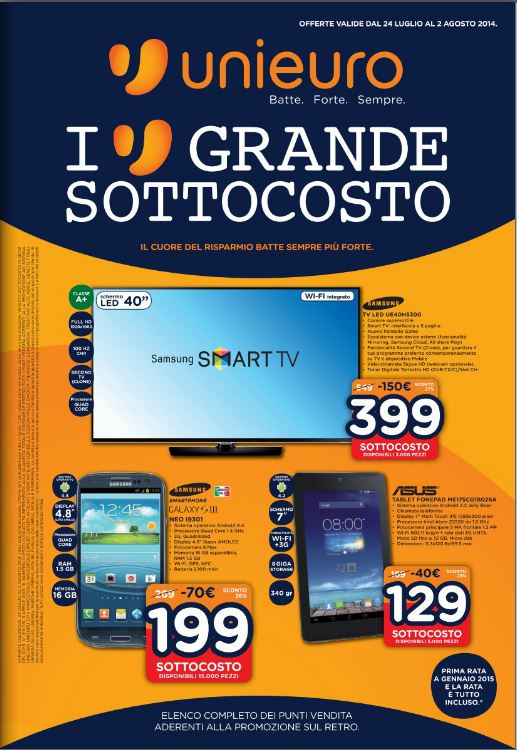 Nuovo sottocosto Unieuro da 24 Luglio al 2 Agosto, tra le tante offerte, che trovate sul volantino, vi segnalo Nokia Lumia 925 e Samsung Galaxy S3 Neo a 199€ !!!