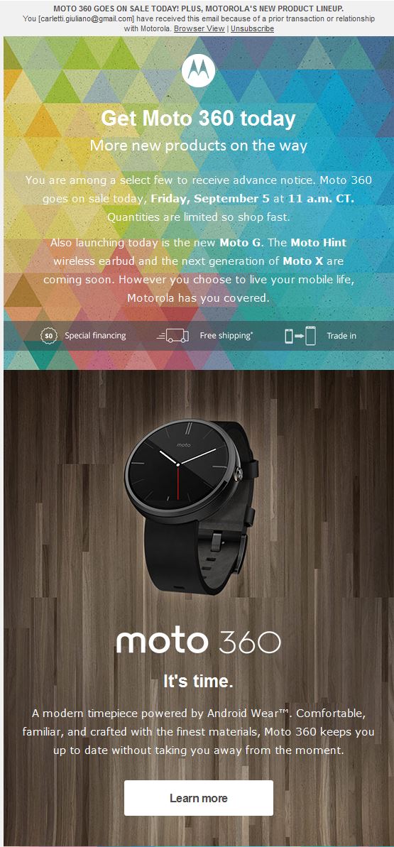 Il tanto atteso Moto 360, smartwatch di Motorola, è da oggi acquistabile ad un prezzo base di 249.99$ con cinturino in pelle, le 2 versioni in metallo arriveranno più tardi