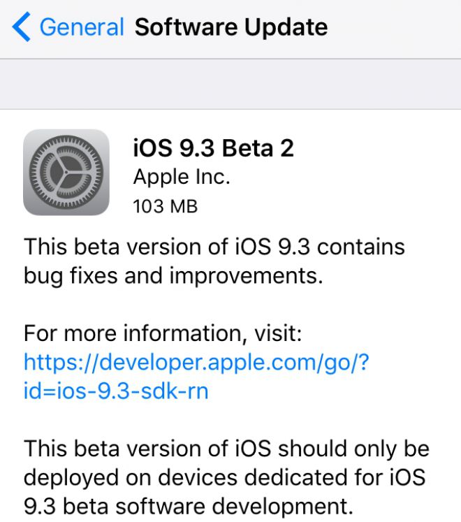 La seconda beta di iOS 9.3 è disponibile per gli sviluppatori iscritti alla fase di testing, sia come aggiornamento OTA che tramite il download da dal sito web per i