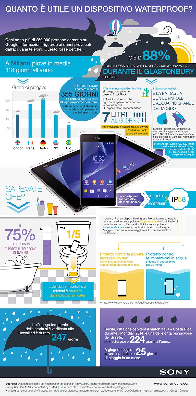 L’estate sembra essere davvero arrivata, ma SONY MOBILE vuole ricordare a tutti i suoi utenti l’importanza di disporre di un device waterproof. Lo sapevi che a Milano piove 118 giorni
